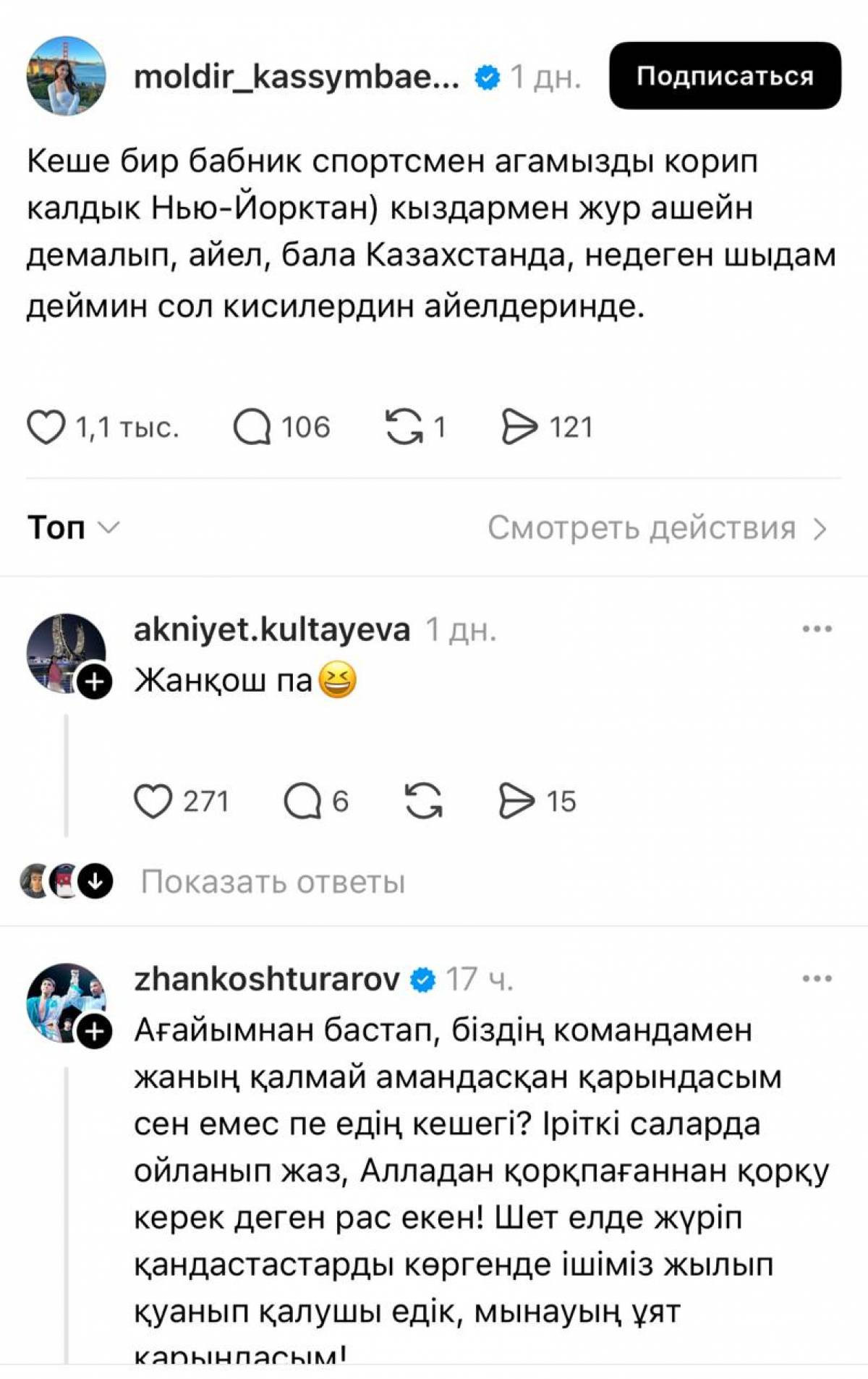 "Кеше бір "бабник" спортсмен ағамызды көріп қалдық Нью-Йорктен. Қыздармен жүр демалып... Әйел, бала Қазақстанда, не деген шыдам деймін сол кісілердің әйелдерінде", - деп жазған Мөлдір есімді қыз.