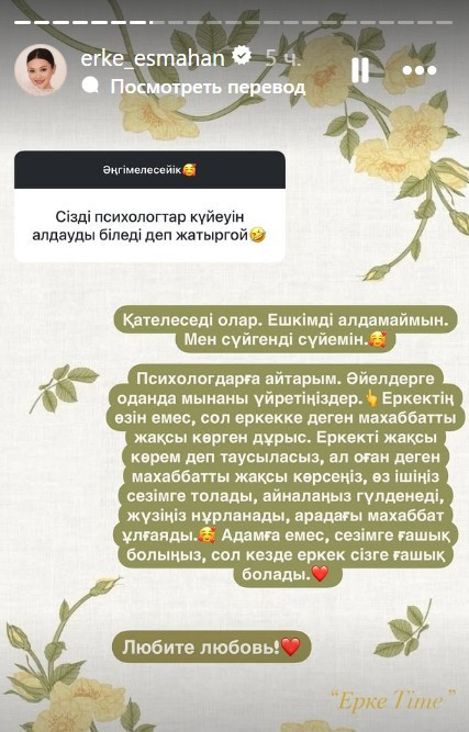 "Қателеседі олар. Ешкімді алдамаймын. Мен сүйгенді сүйемін. Психологтарға айтарым, әйелдерге одан да мынаны үйретіңіздер. Еркектің өзін емес, сол еркекке деген махаббатты жақсы көрген дұрыс. Еркекті жақсы көремін деп таусыласыз. Ал оған деген махаббатты жақсы көрсеңіз, өз ішіңіз сезімге толады, айналаңыз гүлденеді, жүзіңіз нұрланады, арадағы махаббат ұлғаяды. Адамға емес, сезімге ғашық болыңыз. Сол кезде еркек сізге ғашық болады", - деп жазды әнші.