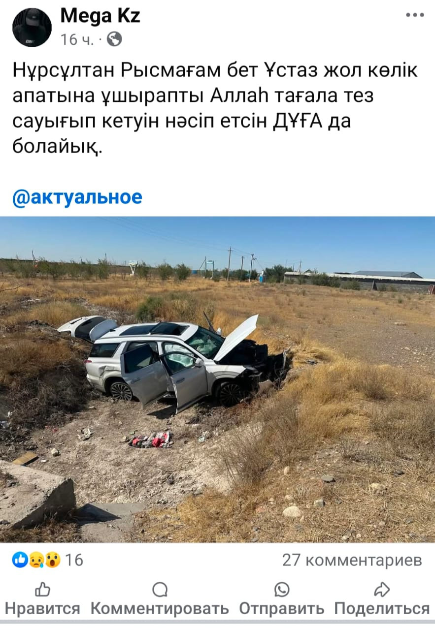«Нұрсұлтан Рысмағамбет ұстаз жол-көлік апатына ұшырапты. Алла тағала тез сауығып кетуін нәсіп етсін, дұғада болайық», - деп жазды ол.