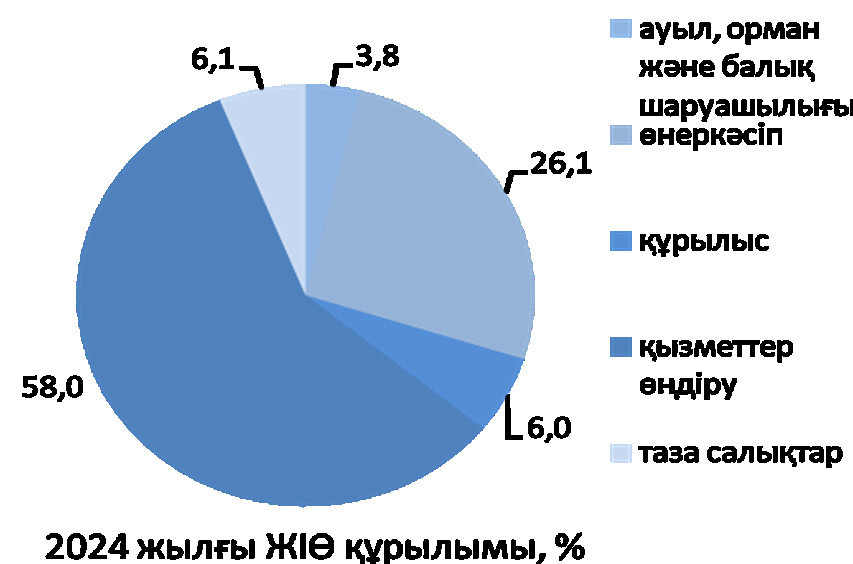 Өндірілген жалпы ішкі өнімнің көлемі 136,6 трлн теңге. ЖІӨ құрылымында тауарлар өндірісінің үлесі 35,9%, қызметтердікі – 58%. ЖІӨ өндірісіндегі негізгі үлес Өнеркәсіп саласына тиесілі – 26,1%.