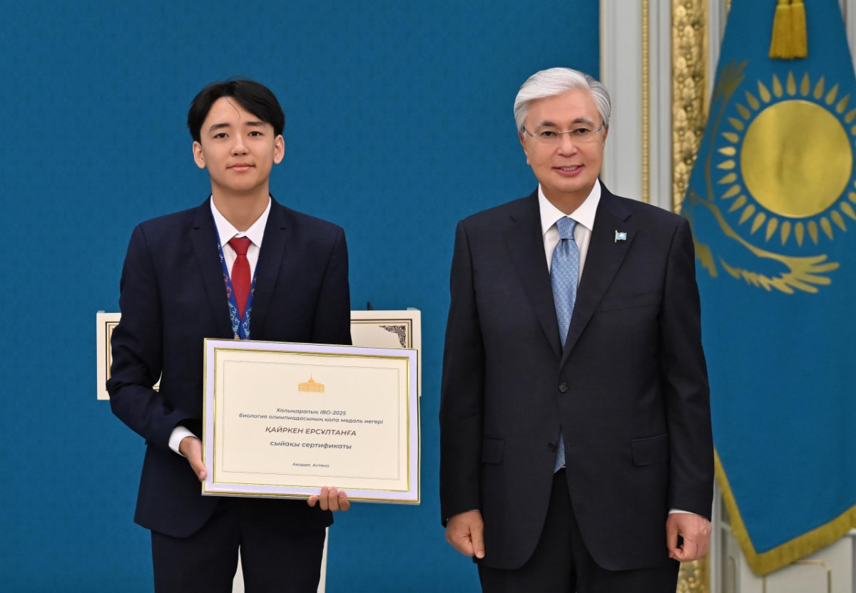 – Жастарымыз жаһандық спорт және өнер додаларында жеңімпаз атанып, Туымызды көкте желбіретіп жүр. Білім саласындағы беделіміз де артып келе жатыр. Былтырдан бері оқушыларымыз 30-дан астам халықаралық олимпиада мен ғылыми жарысқа қатысып, мыңға жуық медаль алды. Оның 200-ге жуығы – алтын, 300-ден астамы – күміс, ал 500-ге жуығы – қола медаль. Бұл тамаша көрсеткіш Қазақстандағы білім сапасының деңгейі жоғары екенін көрсетеді. Тағы да қайталап айтамын, біз әлемдік жарыста ел намысын қорғаған әр жеңімпазды мақтан тұтамыз. Сіздерді еліміздің беткеұстар, лайықты азаматтары деп санаймын. Болашақта да Қазақстанның одан әрі дамуына қомақты үлес қосатындарыңызға кәміл сенемін, – деді Президент.