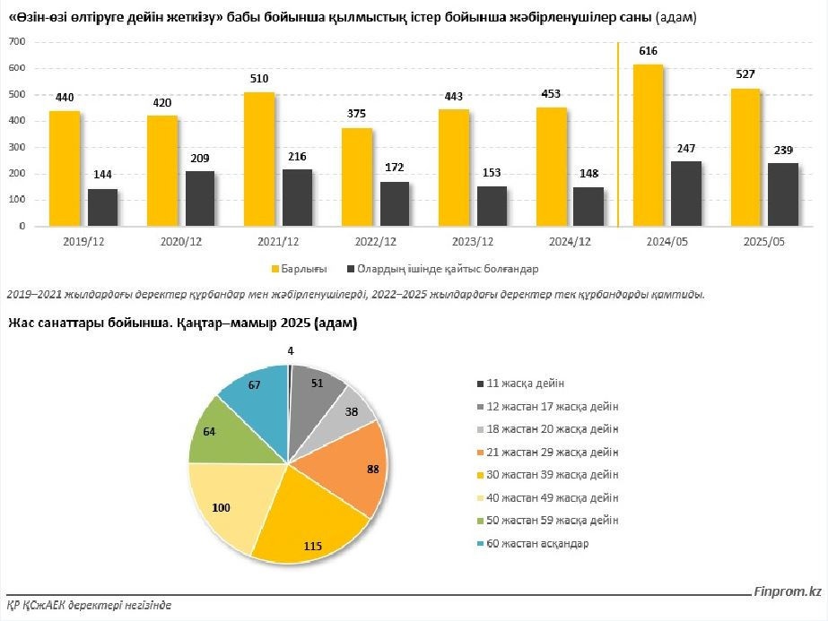 Өзін-өзі өлтіруге дейін жеткізу құрбандары көбіне ер адамдар. Finprom.kz сайтының дерегінше, биылғы жылдың алғашқы бес айындағы статистика бойынша зардап шеккендердің 71,5%-ы немесе 377 адам – ер адамдар. Ең жиі кездесетін жас санаты – 30 мен 49 жас аралығындағы орта жастағы адамдар. Олардың жиынтық үлесі 40,8%-ды құрайды. Осы статистикадағы 18 жасқа дейінгі балалар мен жасөспірімдердің үлесі 10,4% немесе 55 адамды құрайды.