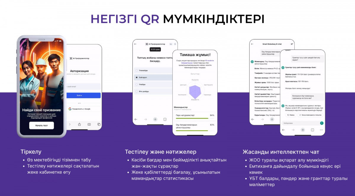 «Kàsip Àlemi» интерактивті ЖИ құралымен интеграцияланған, ол оқушының қызығушылықтары мен негізгі дағдыларын талдау арқылы жеке даму траекториясын қалыптастыруға мүмкіндік береді.
