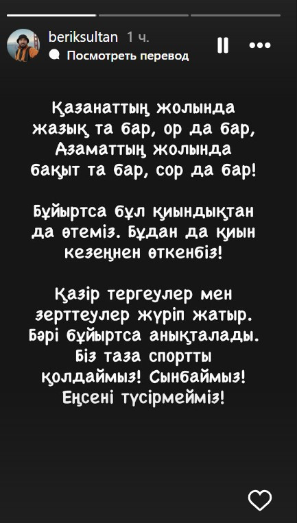«Қазанаттың жолында жазық та бар, ор да бар. Азаматтың жолында бақыт та бар, сор да бар. Бұйыртса бұл қиыншылықтан өтеміз. Бұдан ба қиынынан өткенбіз. Қазір тергеу мен зерттеу жүріп жатыр. Бәрі анықталады. Біз таза спортты қолдаймыз! Сынбаймыз! Еңсені түсірмейміз. Жанкүйерлік, тілеулестік осы жерде көрінеді. Көк ту желбірегенде бәрі тілеулес бола алады. Қиындықта қолдау – басқа деңгей. Ішпей-жемей допинг дауына ұшырадық. Бірақ бұл қиындық та босқа берілмеді бізге. Бұдан да мықты болып, шыңдау үшін деп сенеміз», - деп жазды Берік Сұлтан.