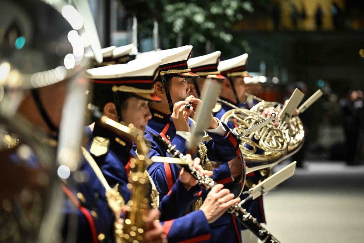 Құрмет қарауылы сап түзеп, қос елдің мемлекеттік әнұрандары шырқалды. Құрмет қарауылының бастығы рапорт бергеннен кейін Қасым-Жомарт Тоқаев пен Санаэ Такаичи бір-біріне ресми делегация мүшелерін таныстырды.