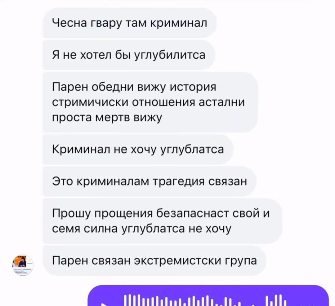 «Чесна гвару там криминал... Парен связан экстремистски група… Безопаснаст свой и семя сильна углублатса не хочу», – деп жазады.