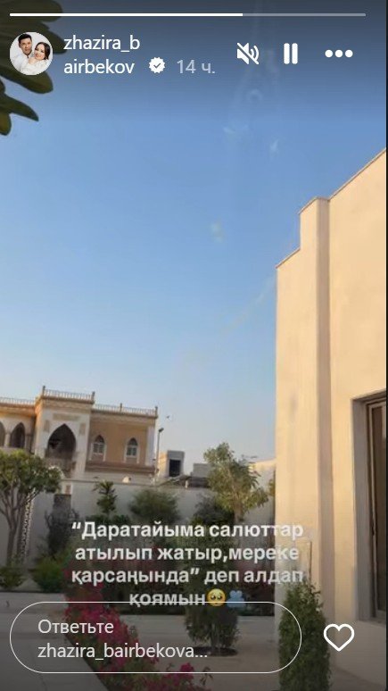 “Директ пен WhatsApp-қа жазып жатқан барлық туған-туыс, дос-жарандарға рақмет. Біз жақсы хабар күтіп отырмыз. Алаңдамаңыздар. Ниеттеріңізге көп рақмет! Алла қаласа жақсы күнде жолығамыз. Даратайымды "мереке қарсаңында салюттер атылып жатыр” деп алдап қоямын. Көзбен көріп, құлақпен естіген қандай қорқынышты ”, – деді Жазира Байырбекова.