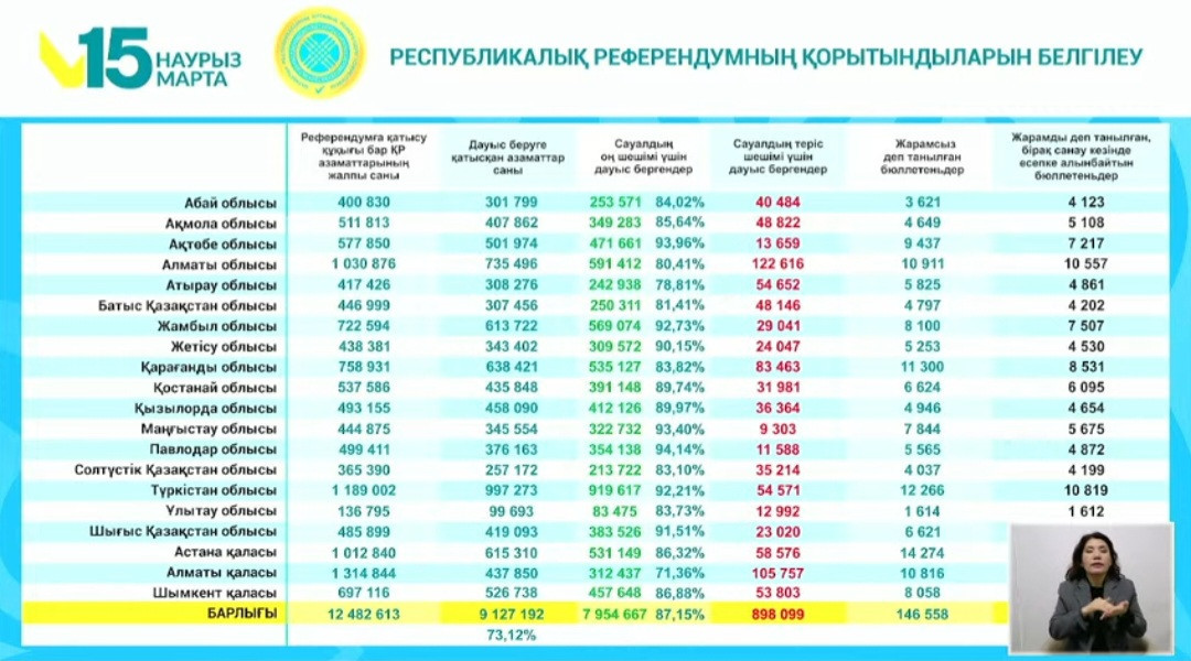 Орталық референдум комиссиясы 15 наурызда Конституцияны өзгертуге қатысты өткен референдумның түпкілікті нәтижесін жариялады, – деп хабарлайды Aikyn.kz.