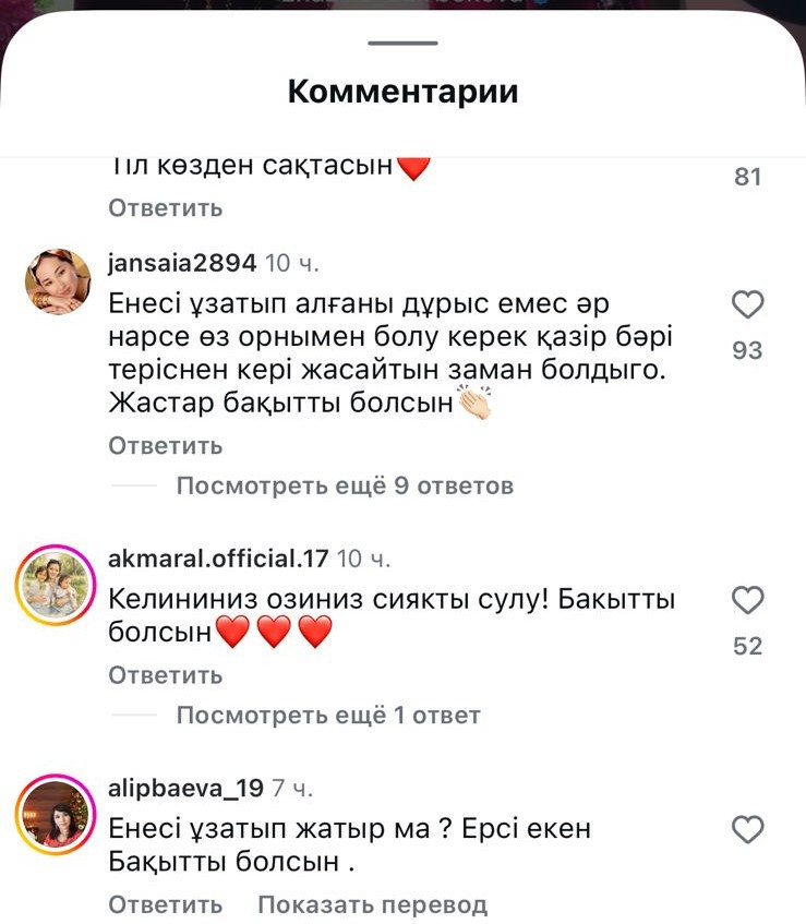 «Енесі өзі ұзатып алғанды бірінші рет көріп тұрмын», «Енесі келінін ұзатып шығарғаны бұл қай жақтың салт дәстүрі?» «Естімеген елде көп деген осы екен ғой», «Енесі ұзатып жатыр ма ? Ерсі екен», «Дұрыс емес, басқа адам жоқ па, қазақтың салтын бұзып» деген пікірлер жазылған.