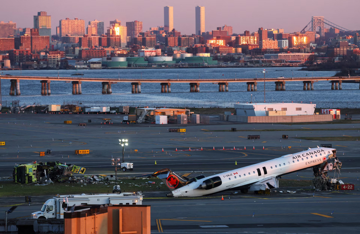 24 наурыз күні Нью-Йорктің Куинс ауданындағы ЛаГуардия әуежайында жер үсті көлігімен соқтығысқан Air Canada Express ұшағының сынықтары. REUTERS/Shannon Stapleton.