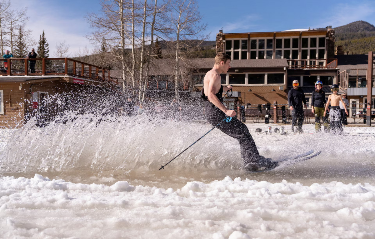 16 жастағы Коул Райнер 21 наурыз күні ауа температурасы шамамен 15 градус болғанда Колорадо штатындағы Кистоун тау шаңғысы курортында шалшық судың үстімен сырғанап барады. Фото: REUTERS/Cheney Orr.