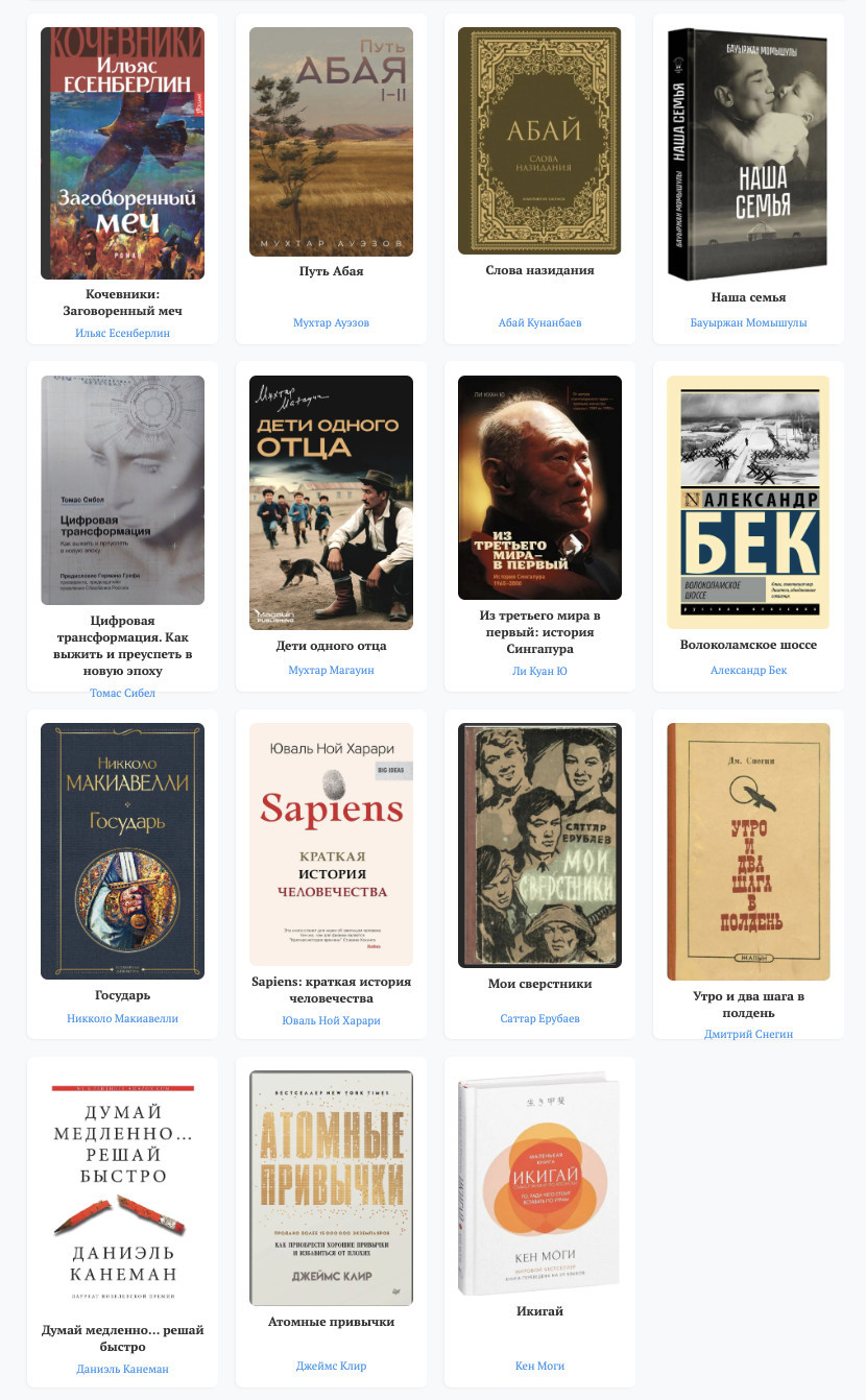 Алты ай бойы қатысушылар арнайы сарапшылар комиссиясы іріктеген 15 кітаптан оқып шықты. Тізімге Абай Құнанбайұлы, Мұхтар Әуезов, Бауыржан Момышұлы, Ли Куан Ю, Томас Сибель секілді авторлардың еңбектері енді.