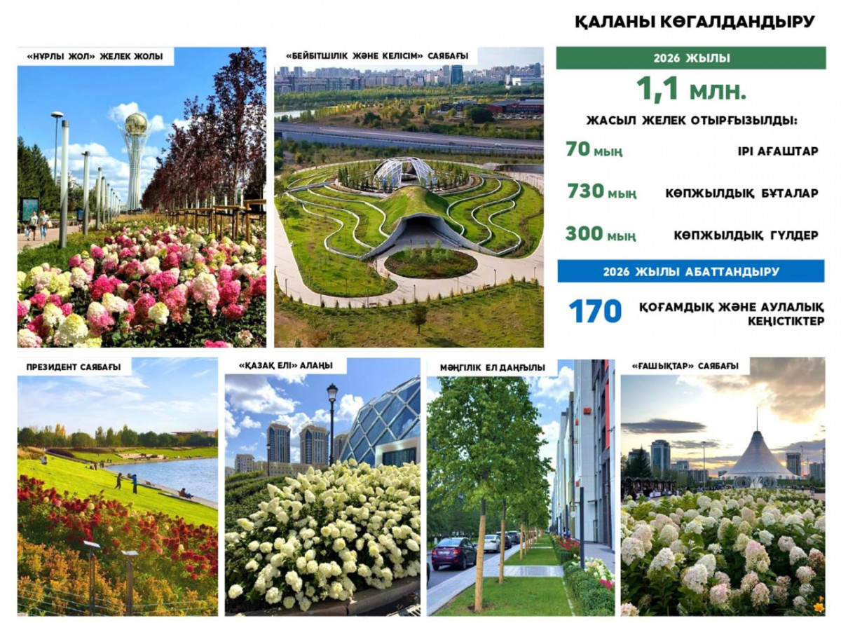 Оның айтуынша, биыл елордада 173 орынды (қоғамдық кеңістіктер мен аулалар) жаңғырту, 1,1 миллион түп жасыл желек, атап айтқанда, көшеттер, бұталар, гүлдер мен ағаштар егу жоспарланып отыр.