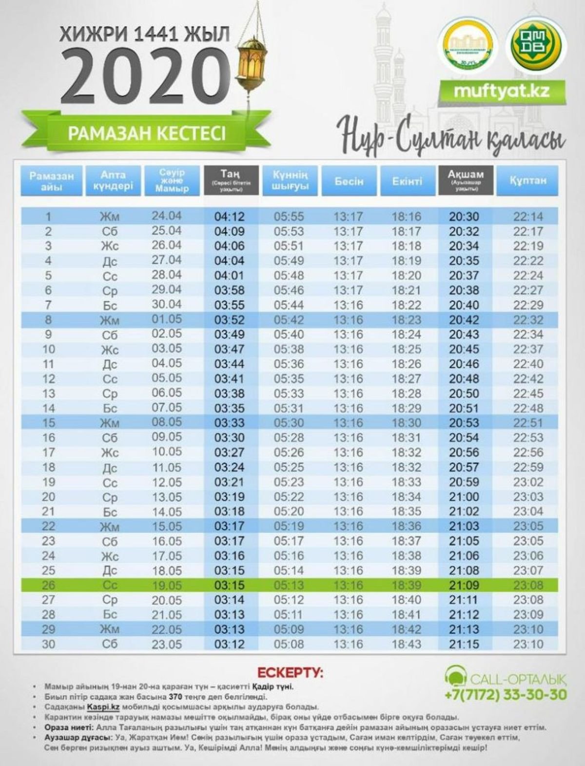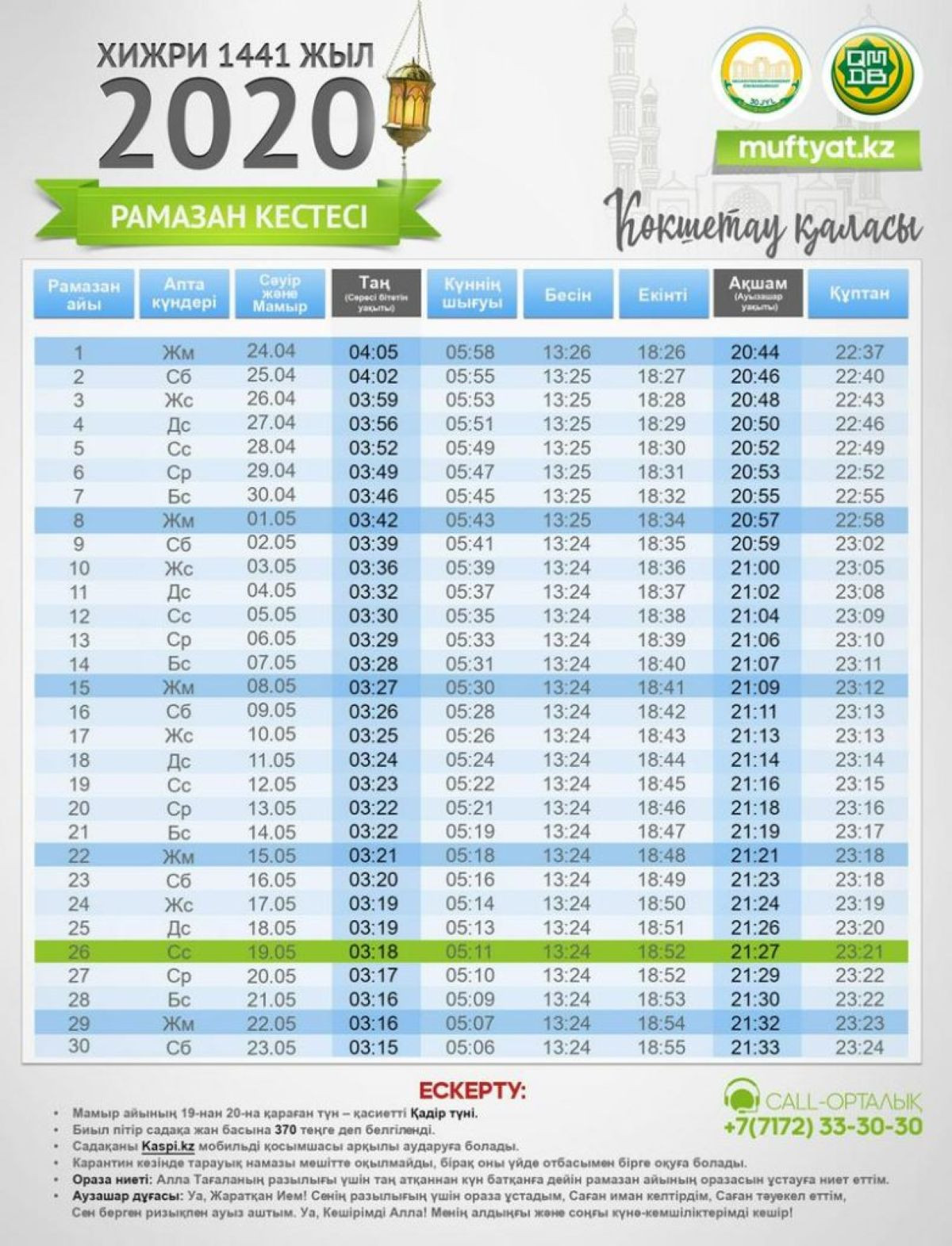Рамазан айы басталды. Ораза айындағы сәресін ішу және ауызашар уақыттарының өңірлер бойынша кестесін ұсынып отырмыз. Қазақстан мұсылмандары діни басқармасының мәліметіне сүйенсек, мамыр айының 19-ынан 20-сына қараған түні – қасиетті Қадір түні. Биыл пітір садақа жан басына 370 теңгеден белгіленді. Төтенше жағдайға байланысты мобильдік қосымша арқылы онлайн төлеуге болады. Карантинге байланысты тарауих намазы мешіттерде оқылмайды. Әр адам өз үйінде оқиды.